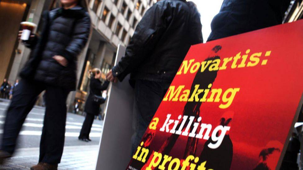• Protest mot patentering Folk demonstrerer utenfor kontoret til det sveitsiske legemiddelfirmaet Novartis i New York, 22. februar i fjor. Novartis saksøkte indiske myndigheter for å distribuere billigkopier av paternterte legemidler. Foto: SPENCER P...