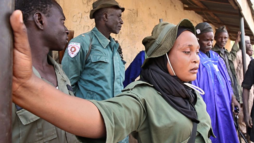Med en høyde på rundt 180 cm, iført grønne jaktklær prydet med et patronbelte over skulderen, er Bakari Gombi en slående figur. Hun er muslim og forlater aldri hjemmet uten å være ikledd slør. Men i likhet med mange andre på landsbygda i Nordøst-Nigeria, tror Bakari Gombi også på den tradisjonelle åndeverdenen. En av oppgavene hennes som sjef, er å sørge for at jegerne får en hemmelig drikk som antas å beskytte dem mot kuler.