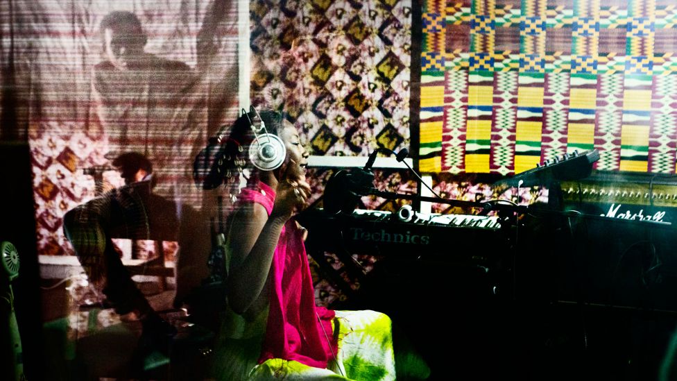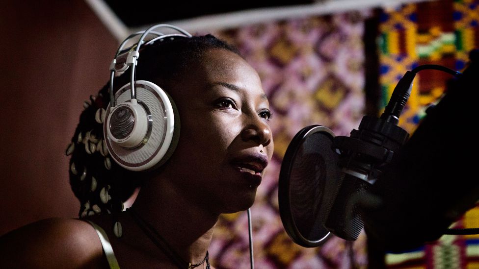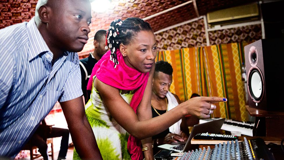 • I sitt nye hus i Bamako, i studioet på taket, spiller Fatoumata Diawarra og Hindi Zahra inn en ny plate som skal ligge til grunn for deres turné.  Diawarra er kjent for sine låter mot omskjæring og er en av Malis største musikkeksporter. «Først er det viktig at man blir glad av musikken, så kan man gå tilbake og ta til seg låtens budskap og alvor», sier hun. Foto: MALIN PALM