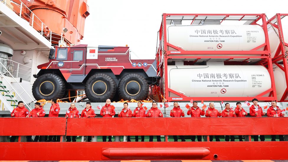 • Tester snødrager Forskere ved polarforskningsskipet Xuelong (Snødragen) vinker farvel til de oppmøtte på kaien i Shanghai 1. november 2025. Som én av to isbrytere la skipet ut på Kinas 42. antarktis-ekspedisjon fra Shanghai til Antarktis for å teste ny teknologi, som sekshjulingen Snow Leopard, under krevende polare forhold. Forskningsskipene skal etter planen returnere til Kina i mai. Foto: Fang Zhe/Xinhua/NTB