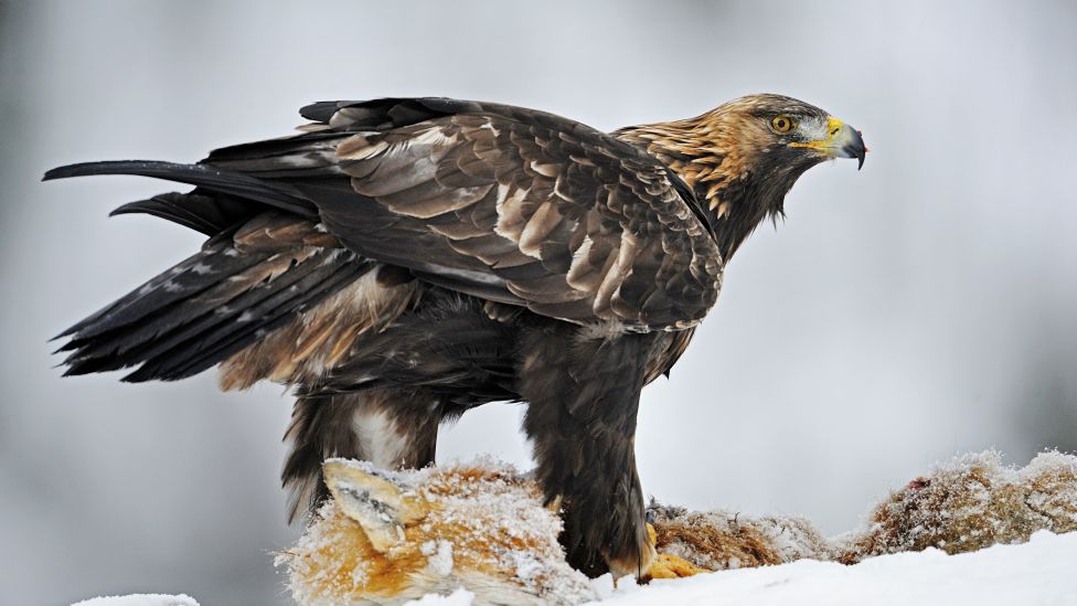 • Kongeørn (Aquila chrysaetos) er blant de fremste symbolene på vill natur, og den nest største rovfuglen i Norge, etter havørn (Haliaeetus albicilla). Siden hav- og kongeørn ble totalfredet i Norge i 1968, har bestanden økt. Smøla på Nordmøre har Europas tetteste havørnbestand. Den første havørn ble sett i Oslofjorden for 130 år siden, nå hekker rundt 3000 havørn-par i Norge. Flere par er satt ut i Skottland og Irland, som har ført til at arten igjen hekker i disse landene. Havørnen anses som mindre aggressiv enn kongeørnen. Her er en kongeørn i Flatanger i Nord-Trøndelag som spiser på en død rev. Foto: STAFFAN WIDSTRAND/WILD WONDERS OF EUROPE