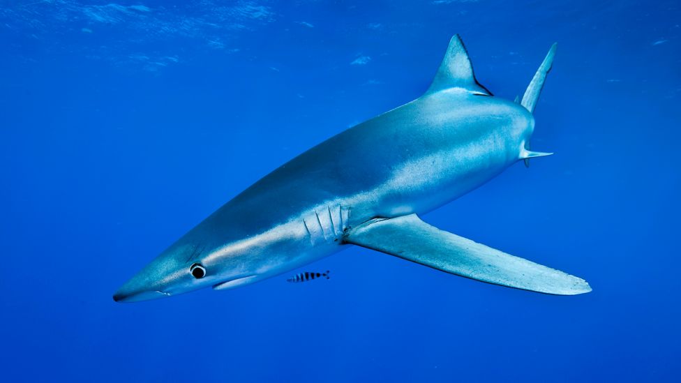 • Blåhai (Prionace glauca) i havdypet ved øygruppen Azorene. Sammen-lignet med landjordens stigende antall nasjonalparker, er fredningsgraden av verdenshavene skremmende lav (15 prosent versus 2 prosent). Rovfiske utenfor de maritime landegrensene er beskrevet som en «miljøkatast-rofe», med en rekke nøkkelarter på IUCNs rødliste. 20 millioner blåhai mister livet årlig, ofre for asiaters forkjærlighet for haifinnesuppe. Også Middelhavet er godt i gang med å etablere maritime «rewilding»-reservater med strenge fiskeforbud og «catch & release»-soner. Foto: MAGNUS LUND-GREN/WILD WONDERS OF EUROPE