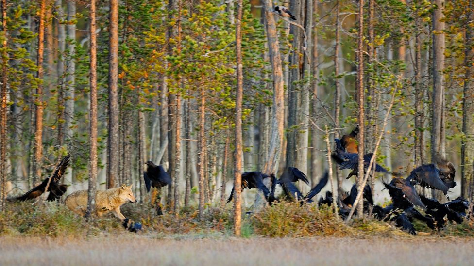 • I EU lever nå 13 000 ulv (Canis lupus), mesteparten fredet ifølge EUs lovverk, men også offer for ulovlig jakt i en rekke land. Bayern nasjonalpark har et tett samarbeid med IUCN. Tre fjerdedeler av parkens natur forblir urørt for å få gaupe og ulv tilbake. Selv søker stadig flere tyskere til opprinnelig skognatur uten inngrep, til elver der otere og bevere lever. 50 ulveflokker og flere gauper ble importert til Tyskland fra Polen. Tidligere jegere har nå tatt jobb som skogforvaltere. Her har en ulvetispe overrasket en flokk ravner (Corvus corax) på vei gjennom et skogholt i Kuhmo, øst i Finland. Foto: STAFFAN WIDSTRAND / WILD WONDERS OF EUROPE