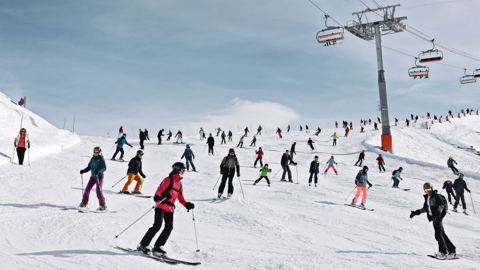Som i Venezia eller Barcelona står fjellturistene tett i tett i bakkene. På grunn av mindre snø i lavere høyder er alpinanleggene som ligger mellom 2000 og 2500 meter over havet, de mest populære og ofte fulle. Parkeringsplassene er fulle, kassene er overfylte, og det er lange køer ved restauranter og heiser. Alle foto: Didier Bizet