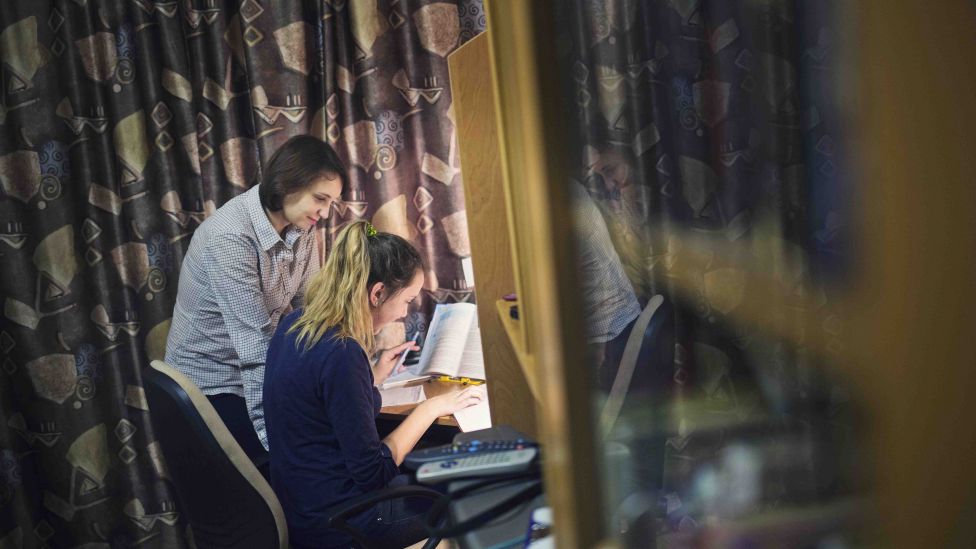 Men i stedet rister vi av oss inspektøren, sniker oss opp trappene, og inn på lærerværelset. Det er bare én lærer som sitter der. Det er Valentina Kolosova (27), som jobber som ukrainsklærer. Hun har en kladdebok – og en ensom elev foran seg.