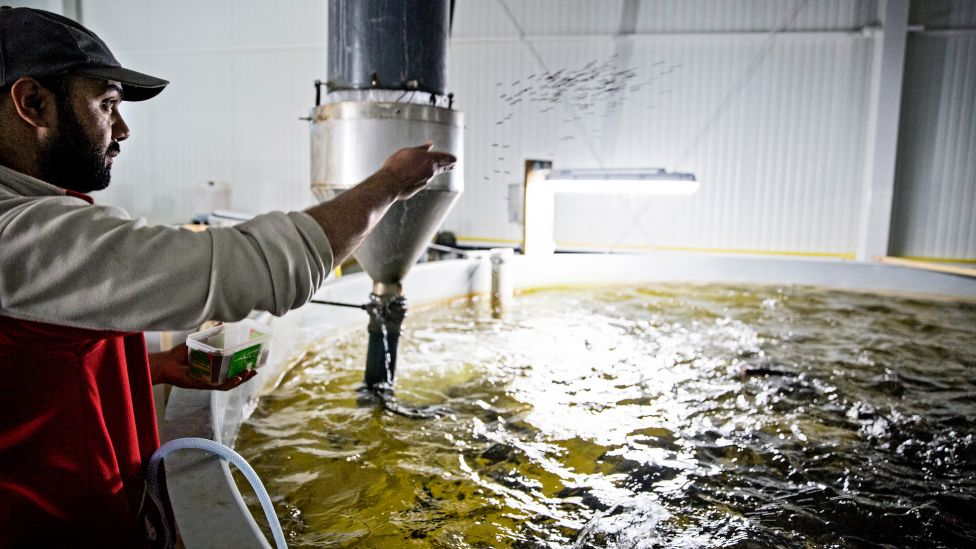 • Kontrollert fõring Det finske fiskefôret Baltic blend som Mohammed Hamid (bildet i midten) fôrer fiskene med, består av 20 prosent fiskemel fra brislingfisket i Østersjøen. Fiskemelet renses for gifter som finnes i fisken, blant annet kan dioksiner skilles ut. Den vegetabilske delen er for det meste soya. Målet er å erstatte dette med mer bærekraftige produkter. I 2019 leverer Peckas Naturodlingar sine første fisker til butikk. «Vi lar dem vokse langsomt og har mindre fett i fôret, noe som gjør kjøttet fastere», sier gründer Hugo Wikström. Foto: MALIN PALM