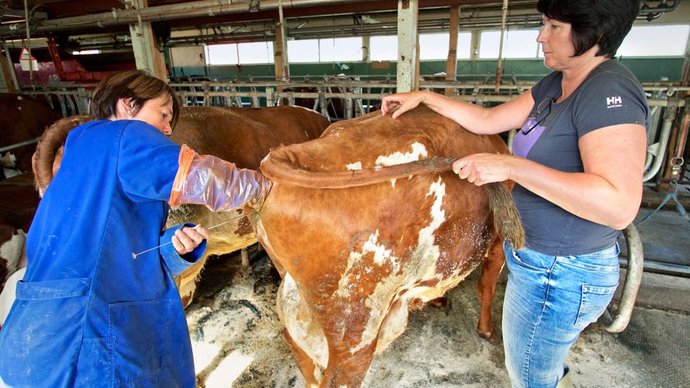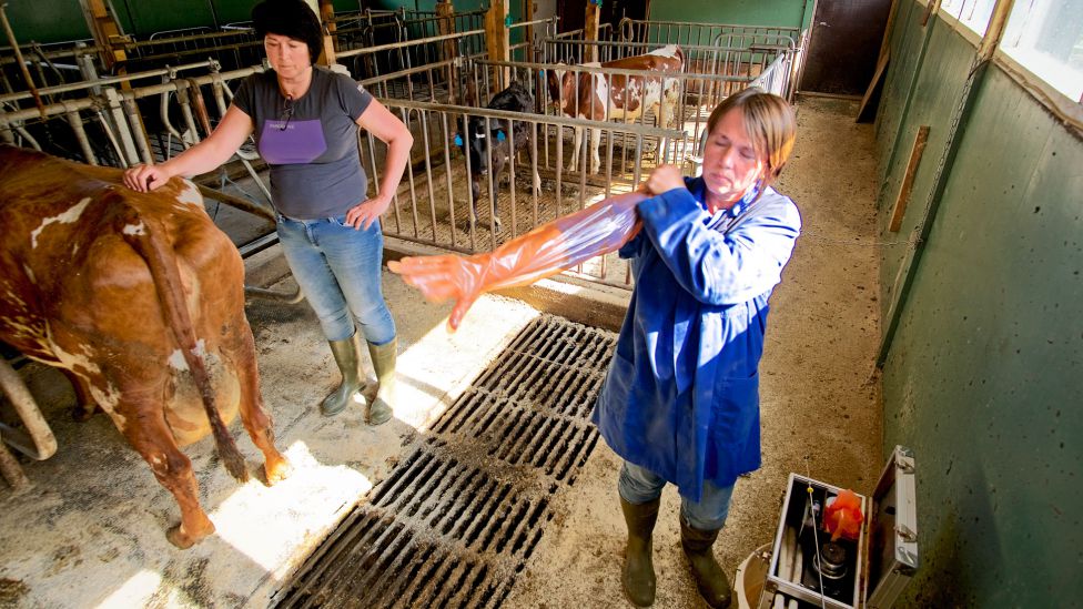 – Slim, sier Åsnes. – Det er brunstslimet som avslører at kua er klar. Se her! Hun stikker hånden mellom beina til kua, trekker den tilbake og viser frem tråder av et klart slim. Når det er perler i slimet, er hun i brunst. Altså er det klart for inseminering. Fatnes tar nå på seg hansker til skuldrene og stikker altså hele armen inn i rumpa på kua for skyfle ut møkk. Mø, sier kua. Navn har hun ikke, men et nummer: 566.