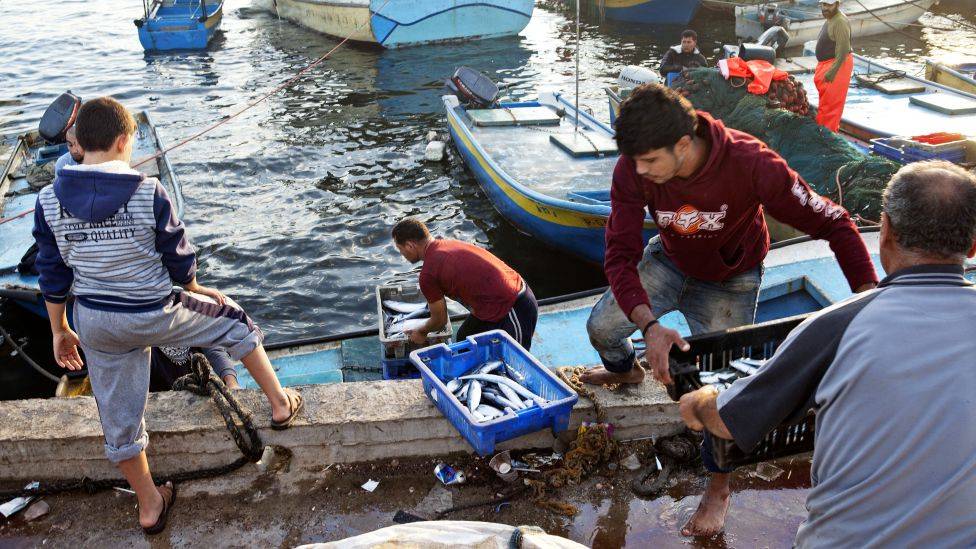 Gaza/Palestina. Klokken har nettopp passert seks om morgenen i Gaza havn. Ennå er det mørkt. En mindre båt har lagt til ved kaien etter nattens fiske, og flere er på vei inn. Vogner trukket av esler, små lastebiler og jeeper står og venter på nattens fangst. Det meste selges på fiskemarkedet like ved.