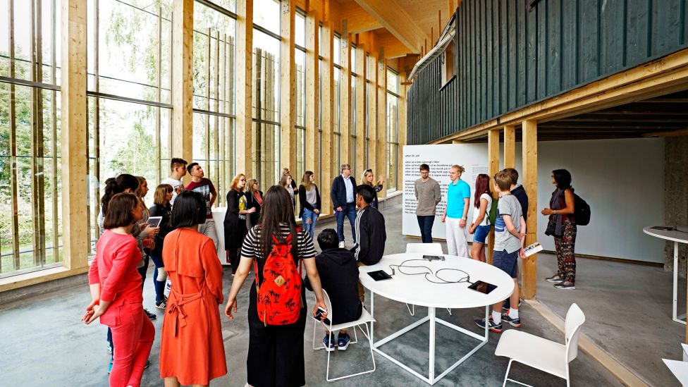 – Byggets undervisningskomponent, læringssenteret, ligger derfor vendt ut mot teltplassen, på bakkenivå, sier Haffner. Her er det utstillingsareal, en liten kinosal og sitteplasser – på utsiden av Kafébygget, men innsiden av søyleveggene.