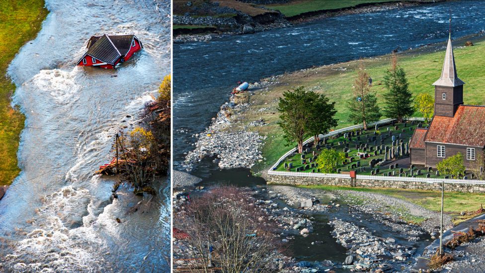 • Under storflommen på Vestlandet i oktober 2014 gikk Flåmselvi i Aurland kraftig over sine bredder, og førte til store skader på hus og eiendommer i Flåm. Kirken og kirkegården sto mirakuløst nok urørt, etter at elven hadde gravd seg helt inntil kanten av kirkegården (til høyre). Foto: HELGE MIKALSEN, VG/TORE MEEK/NTB SCANPIX