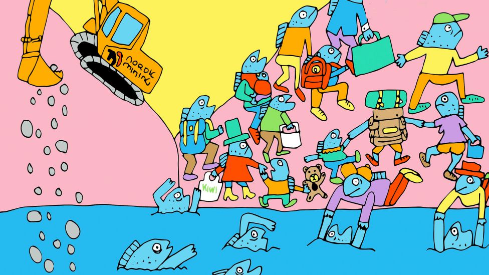 • Flere bergverksforskere mener sjødeponi er den beste løsningen, mens andre forskere roper varsko om alvorlige langtidsvirkninger på marine organismer fra tungmetaller som kadmium og kjemikalier fra selve gruvedriften. Illustrasjon: ANETTE MOI
