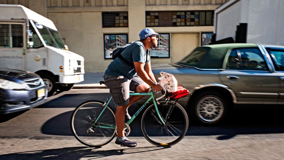 Bryan Gonzales har jobbet i fire år som sykkelbud i New York City. Han sykler med ulike varer mellom ulike adresser i byen, mest mat til privatpersoner. Jobbene får han gjennom en app-tjeneste som heter Caviar. Gonzales er en del av USAs gig-økonomi.