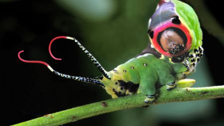 Denne fargerike larven presenterer seg for fienden med en helt spesiell oppvisning. Forkroppen trekkes sammen slik at de fremste kroppsleddene utvides til et underlig hode. Hele «ansiktet» er en bløff. «Klovnenesen» er larvens virkelige hode, og «øynene» er bare svarte flekker. Larven vifter også med røde tråder, som sendes ut av to røre på bakkroppen.